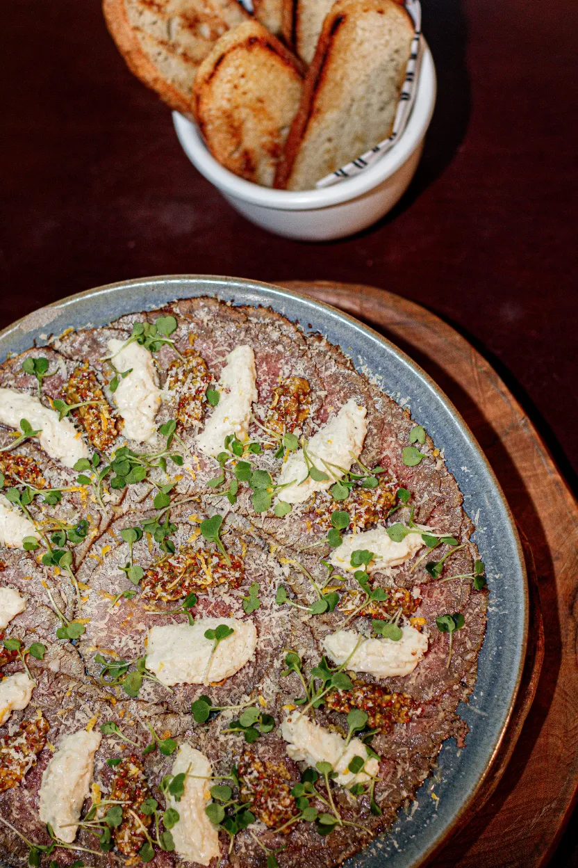 Finas lâminas de RoastBeef, picles de grão de mostarda, creme azedo finalizado com azeite e flor de sal